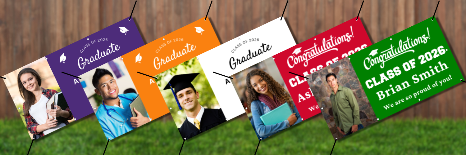 Personalized banners with your graduate’s photo, school colors, and message — ready in just a few days.